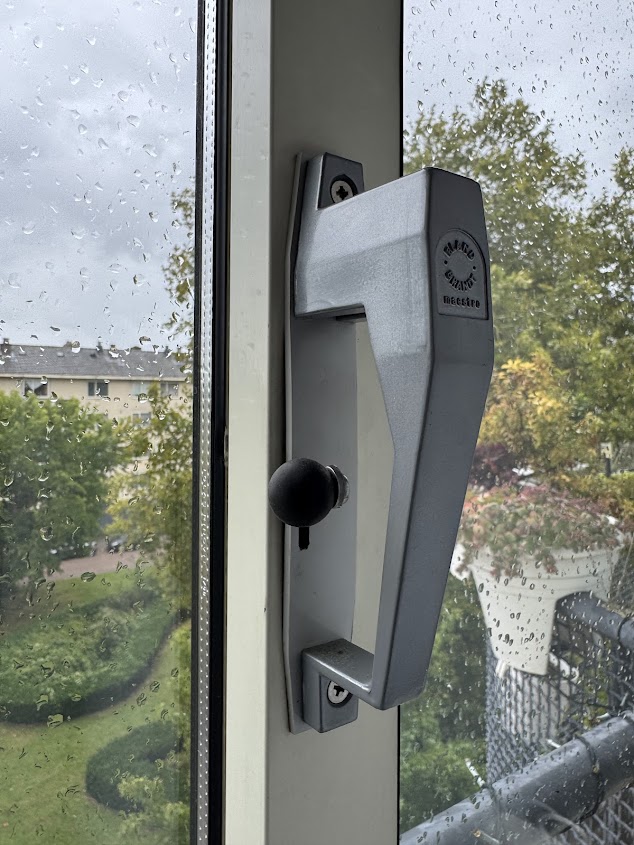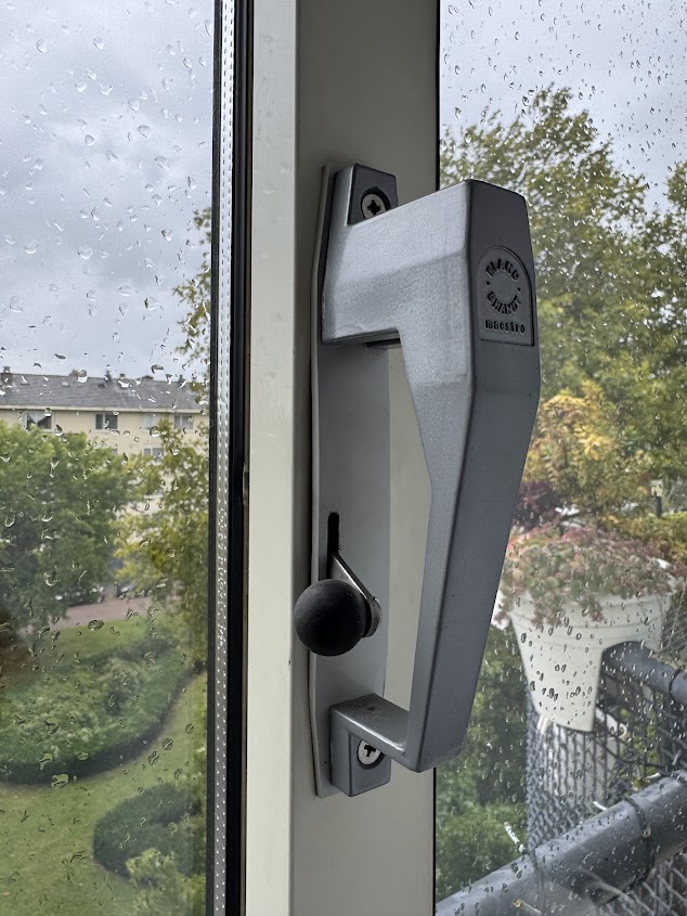 Incorrect: hendel is omlaag dus het raam is niet vergrendeld. Als je aan het handvat trekt zul je zien dat het kozijn los komt van het andere kozijn.